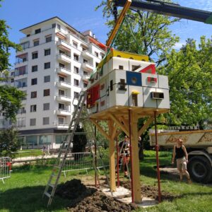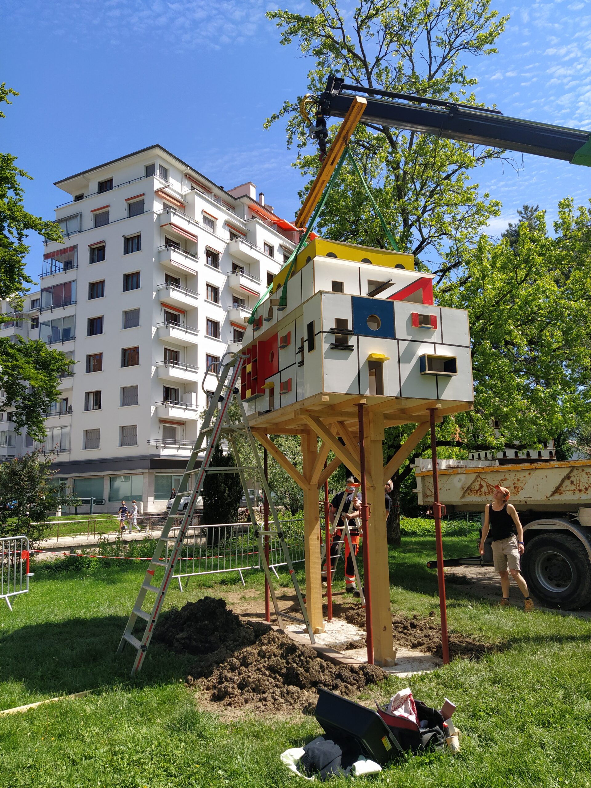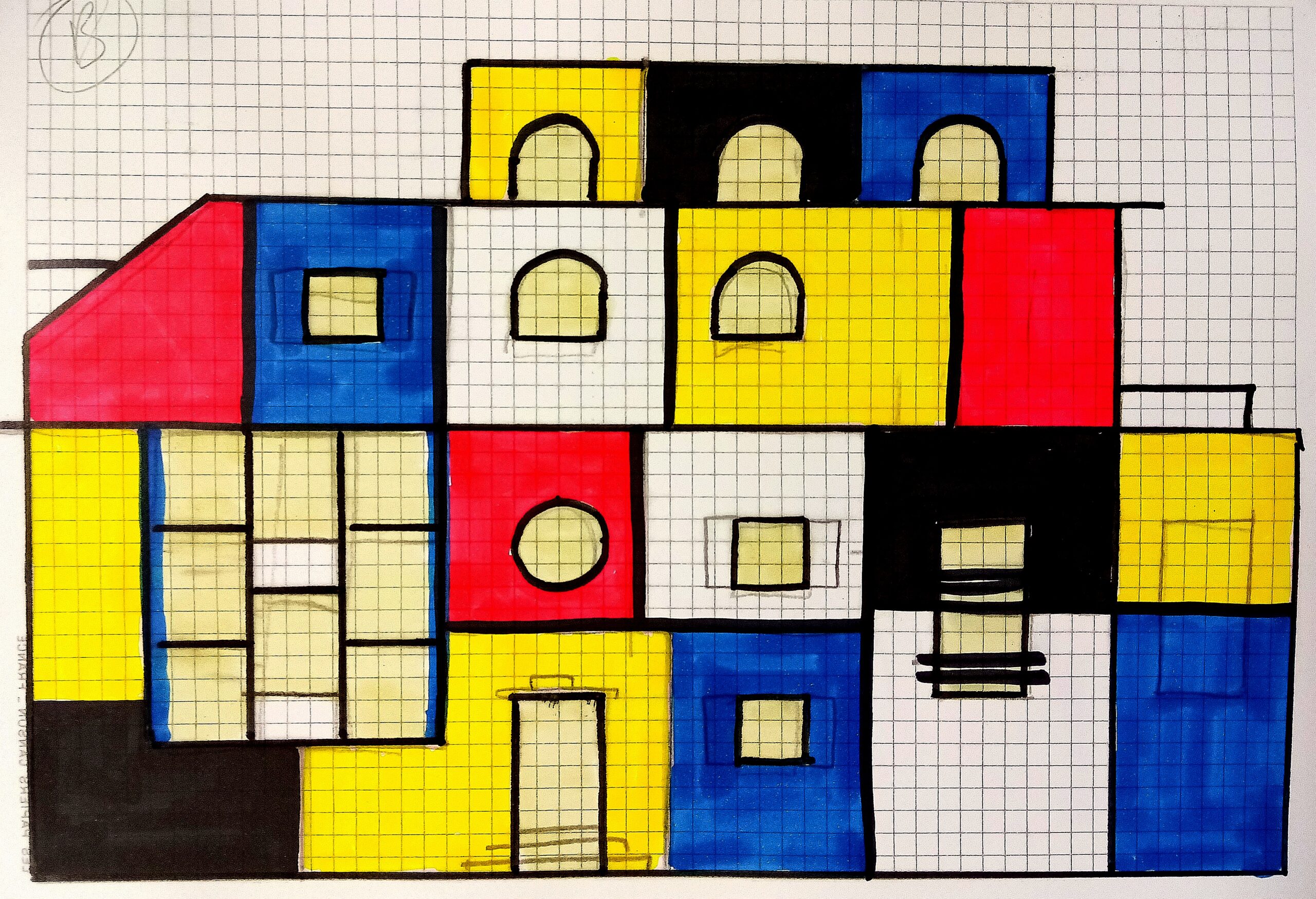 Les assemblages orthogonaux qui constituent cet habitat et sa mise en couleur rendent hommage aux architectures avant-gardistes des années 1920, jouant de contrastes multiples, à la fois sur les formes -plein et vide- et sur les coloris -clair et foncé, et l’utilisation exclusive de couleurs primaires.
